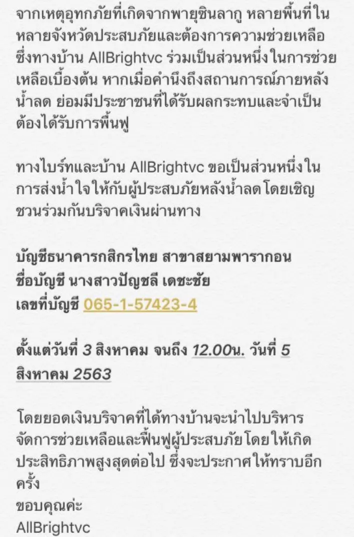 ส่วนด้านซัพพอร์ตไบร์ท allbrightv ก็ได้โพสต์ภาพเปิดรับความช่วยเหลือด้วยเช่นกัน