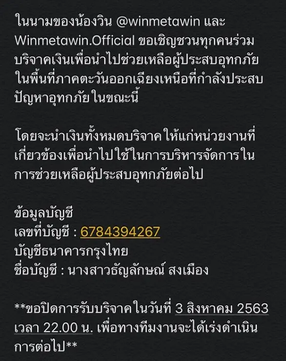 ” ในนามของน้องวิน @winmetawin และ Winmetawin.O ขอเชิญชวนทุกคนร่วมบริจาคเงินเพื่อนำไปช่วยเหลือผู้ประสบอุทกภัยในพื้นที่ภาคตะวันออกเฉียงเหนือที่กำลังประสบปัญหาอุทกภัยในขณะนี้
