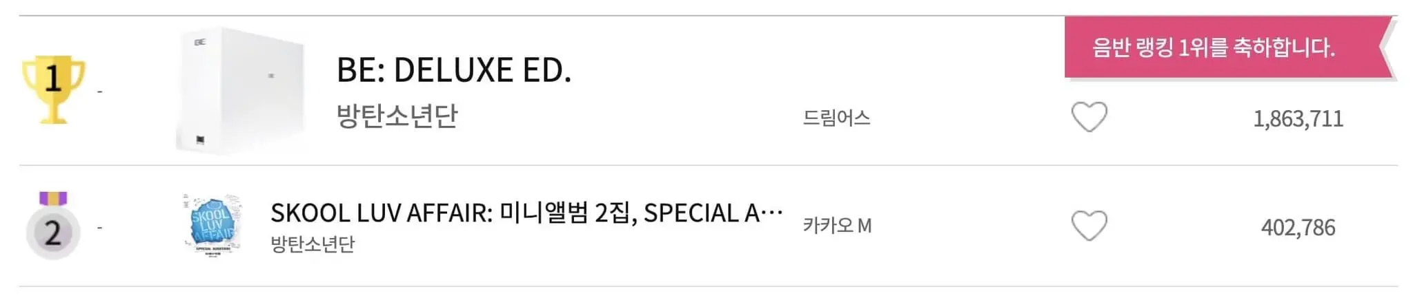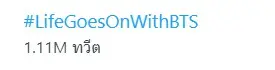 ล่าสุด วง BTS กลับมาประกาศความปังอีกครั้ง หลังจากปล่อยอัลบั้ม BTS BE โดยได้มีการปล่อย MV Life Goes ON เมื่อช่วง 12.00 น. โดยประมาณ (เวลาไทย) ซึ่งก็สามารถกวาดยอดขายอัลบั้มอันดับ 1 ไปด้วย 1,863,711 เรียกได้ว่าสำหรับยอดขายอัลบั้มครั้งนี้ ใช้เวลาไม่ถึงครั้งวันก็กวาดยอดทะลุล้านไปได้ !!
