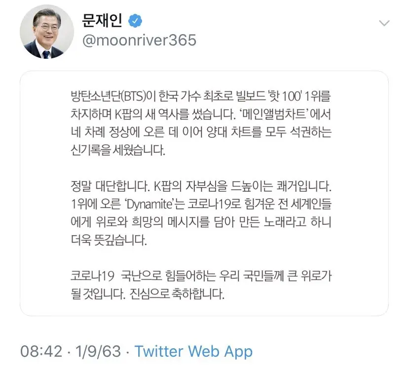 โดยภายหลัง ประธานาธิบดีเกาหลีใต้ “มุนเเจอิน” ได้ออกมาโพสต์ข้อความเเสดงความยินดีกับ BTS ที่สามารถพาเพลง “Dynamite” ขึ้นอันดับ 1 Billboard Hot 100 ได้ เป็นการสร้างชื่อเสียงให้กับวงการ K-POP สู่ระดับสากลได้อย่างภาคภูมิใจ