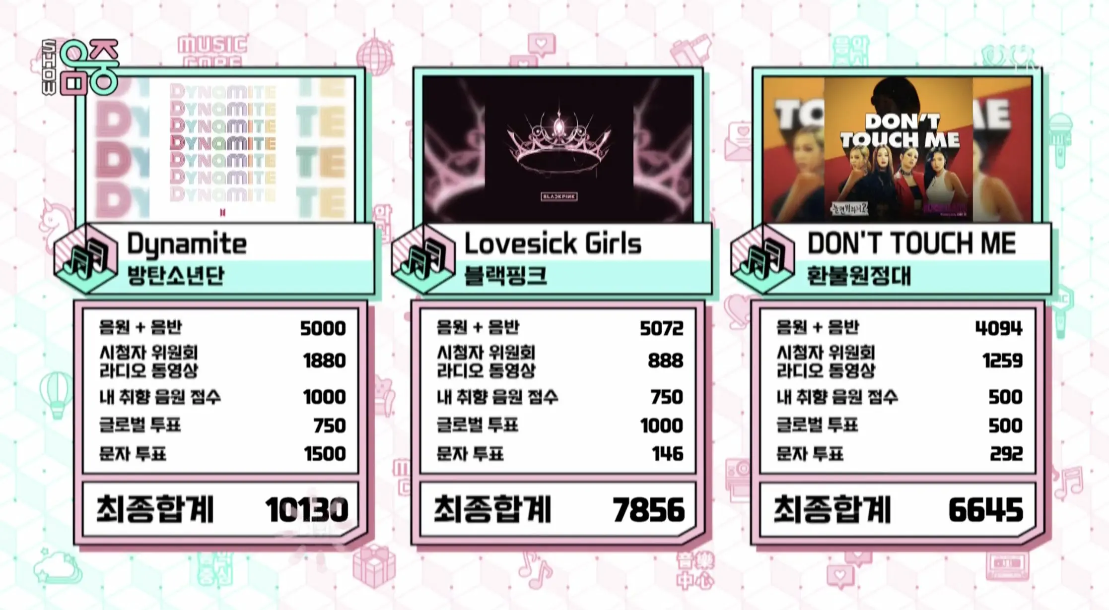 ทั้งนี้ เพลง Dynamite กลายเป็นเพลงที่คว้าเอาถ้วยจากรายการเพลงมาได้มากที่สุดของ BTS โดยเอาชนะเพลง Boy With Luv ที่ได้ถ้วยไปทั้งหมด 21 ถ้วย นอกจากนี้ ชัยชนะจากรายการ Music Core ในครั้งนี้ ก็ถือเป็นชัยชนะครั้งที่ 10 ที่ BTS เคยได้จากรายการนี้