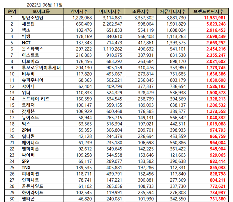 จากการวิเคราะห์ของสถาบันระบุว่ากลุ่มบอยแบนด์ K-POP 30 อันดับแรกในแง่ของมูลค่าแบรนด์ในเดือนนี้ ได้แก่ BTS, Seventeen, EXO, Big Bang, NCT, MONSTA X, ASTRO, The Boyz, TOMORROW x TOGETHER, BTOB , Super Junior, SHINee, WINNER, Stray Kids, TREASURE, GOT7, NU’EST, VIXX, 2PM, Wanna One, ATEEZ, ENHYPEN, Ciipher, SF9, TNX, P NATION, INFINITE, Golden Child, Highlight และ Pentagon