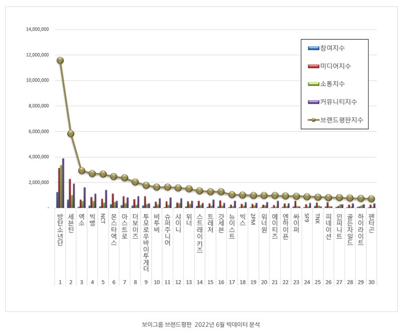 ตั้งแต่วันที่ 11 พฤษภาคมถึงวันที่ 11 มิถุนายน 2565 สถาบันได้วิเคราะห์ข้อมูลขนาดใหญ่ของบอยแบนด์ K-POP ในด้านต่างๆ ตั้งแต่การมีส่วนร่วมของผู้บริโภค กิจกรรมสื่อ การสื่อสาร กิจกรรมชุมชน ฯลฯ