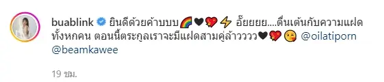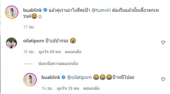 เห็นแบบนี้ ทางด้านของบัวก็กลัวว่าจะตกเทรนด์หรือเปล่า ก็ออกอาการอ้อนสามีอย่างหนัก โดยโพสต์แคปชั่นว่า “แล้วคู่เราเอาไงดีคะป๊า @tumviri ต้องรีบแล้วมั้ยเดี๋ยวตกเทรนด์😆☺” จนทางด้านสามีของบัว มาตอบในโพสต์นี้ว่า “อยากมีก็กลัวจะต้องไว้หนวด” ซึ่งก็มีแฟนคลับหลาย ๆ คนก็มาเชียร์ให้ทางคู่ของบัวมีลูกแฝดอีกคู่เหมือนกัน