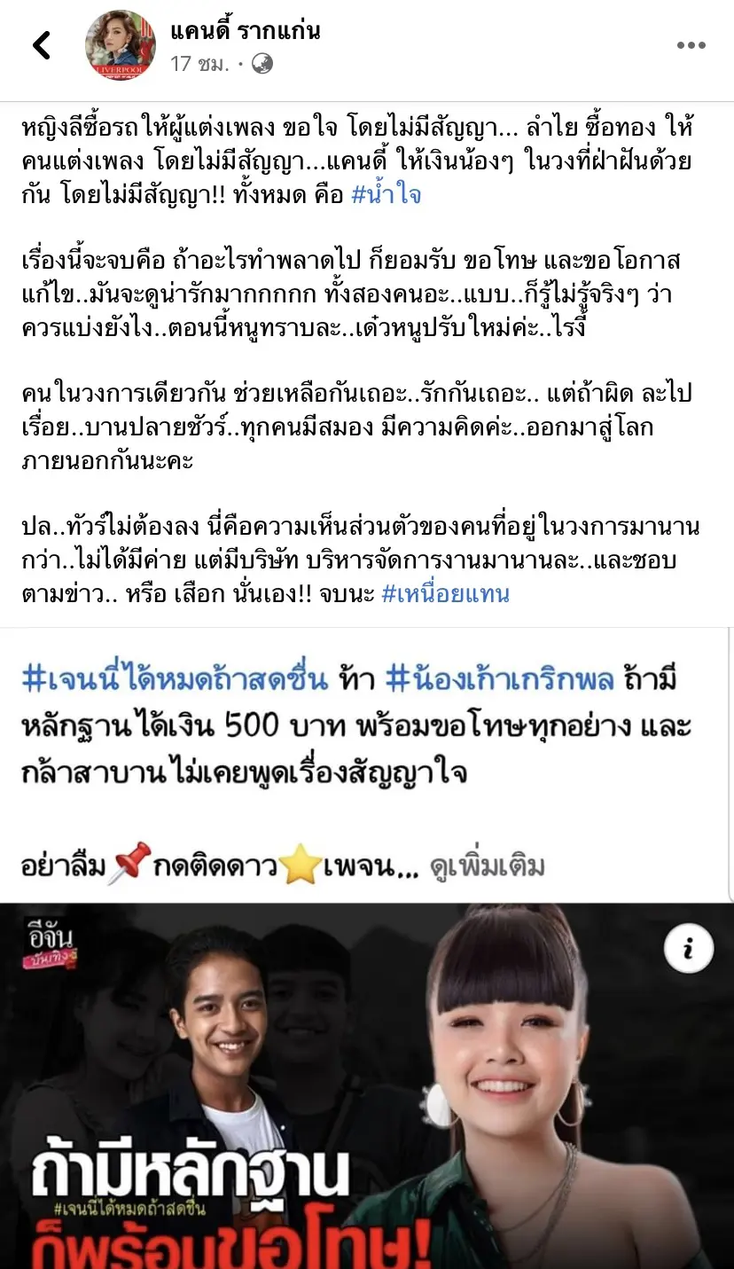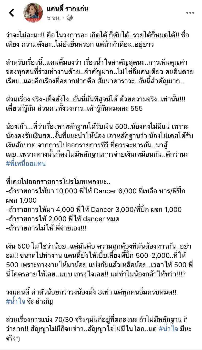 ล่าสุดทางด้าน แคนดี้ รากแก่น ก็ได้ออกมาแสดงความเห็นเกี่ยวกับเรื่องนี้ด้วยความดุเดือด ว่าเรื่องนี้เรื่องน้ำใจเป็นเรื่องที่สำคัญ ำหรับคนที่ร่วมงานกัน ทกุอย่างพิสูจน์ได้ เดี๋ยวคนก็รู้กันทั้งวงการ โดยเธอได้ระบุข้อความเอาไว้ว่า