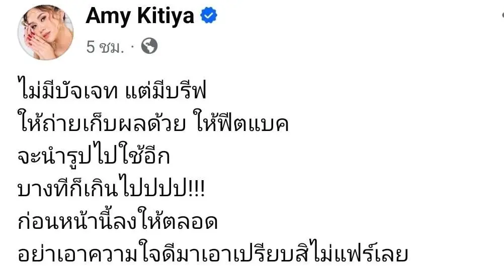 Amy โพสต์ว่าเธอได้รับสินค้าจากแบรนด์หนึ่งโดยไม่มีการว่าจ้าง แต่กลับได้รับบรีฟงานละเอียด ทั้งให้เก็บผลลัพธ์ ถ่ายภาพ รีวิว และให้ฟีดแบคครบเซ็ต ทั้งที่เป็นการทำงานฟรี! ยิ่งไปกว่านั้น แบรนด์ยังมีการขอภาพไปใช้ต่อ โดยไม่มีการตกลงเรื่องลิขสิทธิ์ภาพหรือค่าตอบแทนชัดเจน ทำให้เธอรู้สึกไม่สบายใจ พร้อมทิ้งท้ายแรง ๆ ว่า