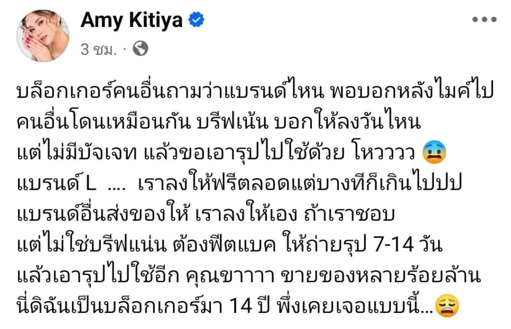 กลายเป็นประเด็นร้อนในวงการบิวตี้อินฟลูฯ เมื่อ Amy Kitiya บิวตี้บล็อกเกอร์ระดับตัวแม่ที่อยู่ในวงการมากว่า 14 ปี ออกมาโพสต์เปิดใจถึงประสบการณ์ไม่แฟร์กับ “แบรนด์ L” ที่ส่งของมาให้รีวิวโดยไม่มีค่าจ้าง แต่กลับแนบบรีฟแน่นมาก แถมมีการขอใช้ภาพต่อโดยไม่พูดคุยล่วงหน้า งานนี้สะเทือนไปทั้งวงการรีวิว!