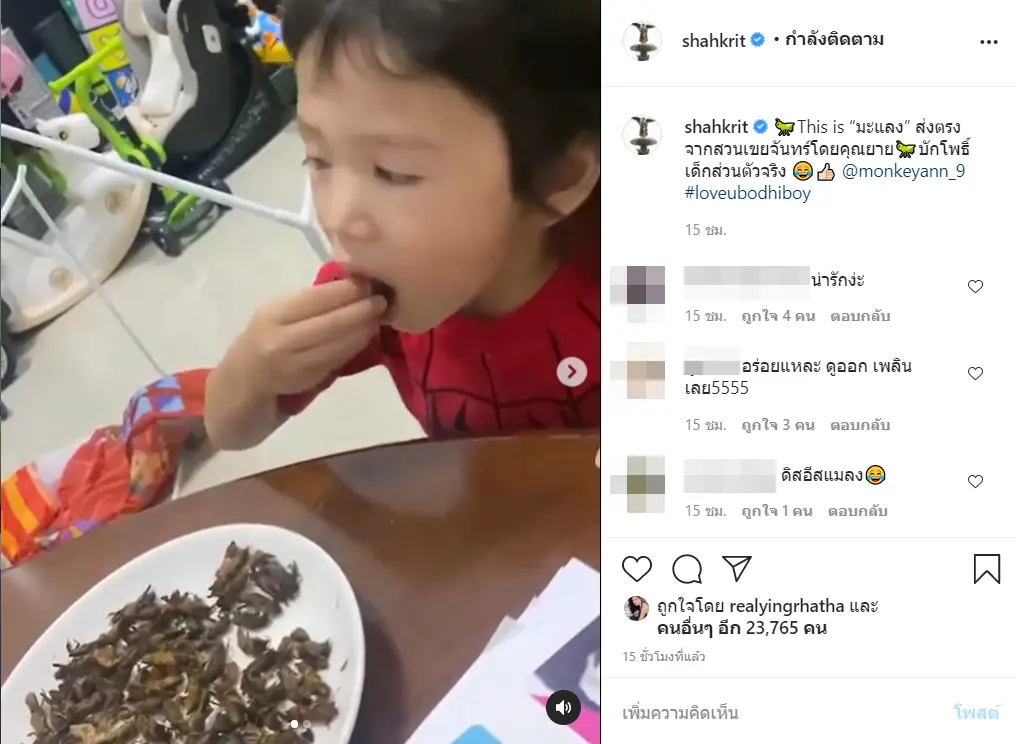 โดยคุณพ่อชาคริต แย้มนาม ก็ได้โพสต์คลิปของลูกชายสุดที่รักลงอินสตาแกรม พร้อมแคปชั่น ‘?This is “มะแลง” ส่งตรงจากสวนเขยจันทร์โดยคุณยาย?บักโพธิ์ เด็กส่วนตัวจริง ??? @monkeyann_9 #loveubodhiboy’ งานนี้บอกเลยว่าสำหรับสายแมลงทอดมีน้ำลายสอ เพราะน้องโพธิ์ได้รับประทานแมงกะชอน หรือ แมงจีซอน โชว์ได้อย่างเพลินมากจนได้รับคำชมเปาะว่า กินง่าย เก่งจังเลยหนุ่มน้อย! เพราะแมลงแบบนี้ บางคนกลัวไม่กล้าทานหรือจับเลยก็มี