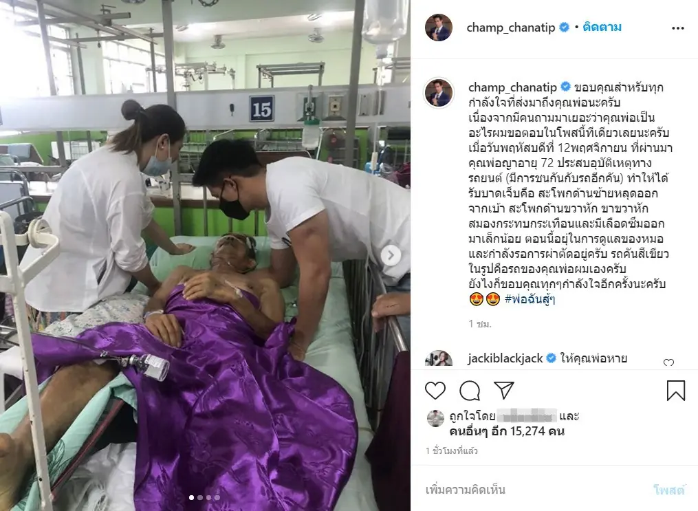เป็นอีกหนึ่งเหตุการณ์ที่หลายๆคนร่วมกันส่งกำลังใจ สำหรับ แชมป์ ชนาธิป นักแสดงและนายแบบ ที่รู้จักกันดีในบท ไตรทศ จากละครเรื่อง ระเริงไฟ และ กรงกรรม ในบทบาท อาตง ซึ่งเจ้าตัวได้ออกมาโพสต์ ถึงคุณพ่อที่ประสบอุบัติเหตุทางรถยนต์ ผ่านอินสตาแกรมส่วนตัวว่า “ขอบคุณสำหรับทุกกำลังใจที่ส่งมาถึงคุณพ่อนะครับ เนื่องจากมีคนถามมาเยอะว่าคุณพ่อเป็นอะไรผมขอตอบในโพสนี้ทีเดียวเลยนะครับ เมื่อวันพฤหัสบดีที่ 12พฤศจิกายน ที่ผ่านมาคุณพ่อญาอายุ 72 ประสบอุบัติเหตุทางรถยนต์ (มีการชนกันกับรถอีกคัน) ทำให้ได้รับบาดเจ็บคือ สะโพกด้านซ้ายหลุดออกจากเบ้า สะโพกด้านขวาหัก ขาขวาหัก สมองกระทบกระเทือนและมีเลือดซึมออกมาเล็กน้อย ตอนนี้อยุ่ในการดูแลของหมอ และกำลังรอการผ่าตัดอยู่ครับ รถคันสีเขียวในรูปคือรถของคุณพ่อผมเองครับ ยังไงก็ขอบคุณทุกๆกำลังใจอีกครั้งนะครับ?? #พ่อฉันสู้ๆ”
