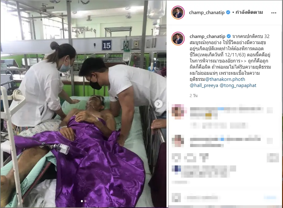 หัวอกคนเป็นลูกเมื่อเห็นว่าพ่อของตัวเองนั้นจะไม่ได้รับความเป็นธรรม ทำให้ เเชมป์ ชนาธิป โพธิ์ทองคำ ได้ออกมาโพสต์ผ่านไอจีของตัวเองว่า จากคนปกติครบ 32 สมบูรณ์ทุกอย่าง ใช้ชีวิตอย่างมีความสุข อยู่ๆเกิดอุบัติเหตุทำให้ต้องพิการตลอดชีวิต(เหตุเกิดวันที่ 12/11/63) ตอนนี้คดีอยู่ในการพิจารณาของอัยการ>> ถูกก็คือถูก ผิดก็คือผิด ถ้าพ่อผมไม่ได้รับความยุติธรรม ผมไม่ยอมแน่ๆ เพราะผมเชื่อในความยุติธรรม ไปเมื่อวันก่อน