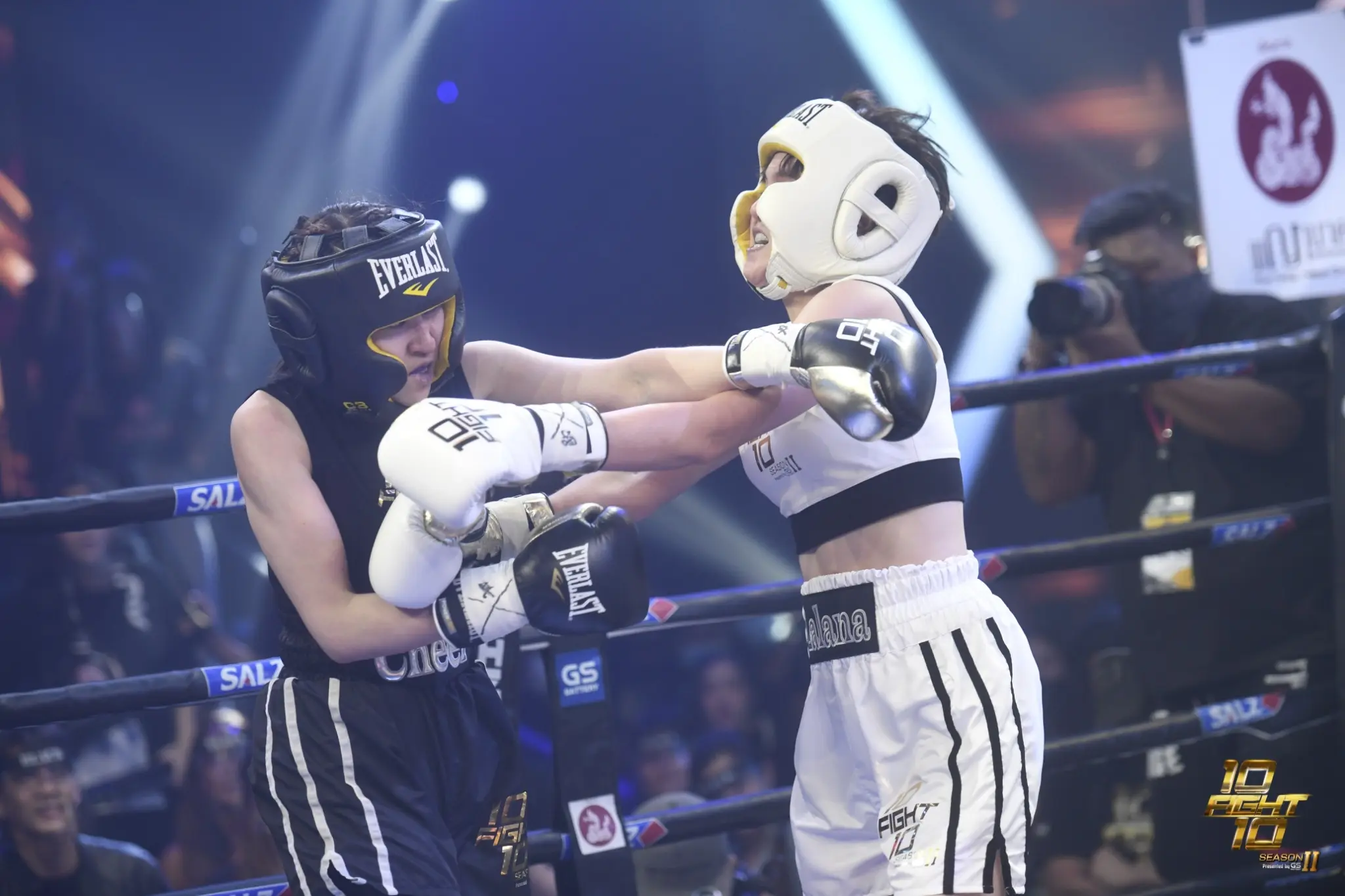 10 Fight 10 สังเวียนมวยซุปตาร์หญิงคู่แรกของเมืองไทยที่ทุกคนรอคอย พิกัดน้ำหนักน้ำหนักในการชกครั้งนี้ 57 กิโลกรัม ระหว่าง เจี๊ยบ ลลนา ชั่งได้ 55.40 กิโลกรัม สัตว์ประจำตัว “พะยูน” จากทีมขาว ปะทะเดือดกับเพื่อนรัก เชียร์ ฑิฆัมพร น้ำหนัก 56.65 กิโลกรัม สัตว์ประจำตัว “กระต่ายป่า” จากทีมดำ ถือว่าเป็นมิติใหม่ของวงการบันเทิงไทยและวงการกีฬา
