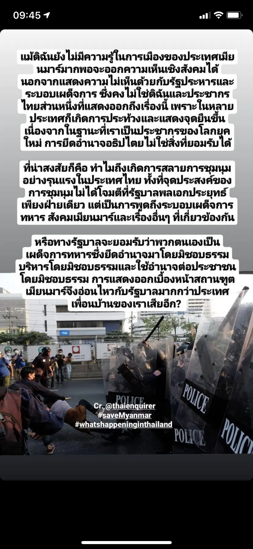เฌอเอม – จากกรณีเมื่อวันที่ 1 ก.พ. 64 ที่มีการเกิดเหตุปะทะกันระหว่างตำรวจ และกลุ่มผู้ประท้วงหน้าสถานเอกอัครราชทูตเมียนมาร์ประจำประเทศไทย เพื่อต่อต้านการทำรัฐประหารในเมียนมา ชาวไทยและชาวเมียนมา มาร่วมชุมนุมโดยสงบ ตามประกาศนัดชุมนุมของเพจวีโว โดยในการการชุมนุมมีการปราศรัยในภาษาไทย และเมียนมา ตำรวจควบคุมฝูงชนตั้งแถวเตรียมสลายการชุมนุม เพื่อขอคืนพื้นที่บริเวณด้านหน้าสถานเอกอัครราชทูต โดยตำรวจได้ประกาศผ่านลำโพงให้ยุติการชุมนุม จากนั้นก็เกิดการปะทะ มีเจ้าหน้าที่ใช้กระบองตีผู้ชุมนุม ด้านผู้ชุมนุมบางส่วนขว้างปาสิ่งของใส่ตำรวจควบคุมฝูงชน
