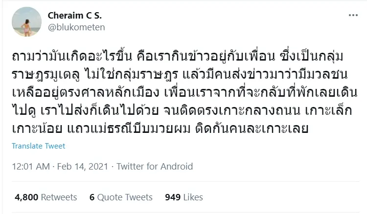 ซึ่งหลังจากที่เธอได้ทวิตออกมาแล้วนั้น ก็ได้มาอธิบายเพิ่มเติมถึงกรณีดังกล่าวว่า “ถามว่ามันเกิดอะไรขึ้น คือเรากินข้าวอยู่กับเพื่อน ซึ่งเป็นกลุ่มราษฎรมูเตลู ไม่ใช่กลุ่มราษฎร แล้วมีคนส่งข่าวมาว่ามีมวลชนเหลืออยู่ตรงศาลหลักเมือง เพื่อนเราจากที่จะกลับที่พักเลยเดินไปดู เราไปส่งก็เดินไปด้วย จนติดตรงเกาะกลางถนน เกาะเล็กเกาะน้อย แถวแม่ธรณีบีบมวยผม ติดกันคนละเกาะเลย”