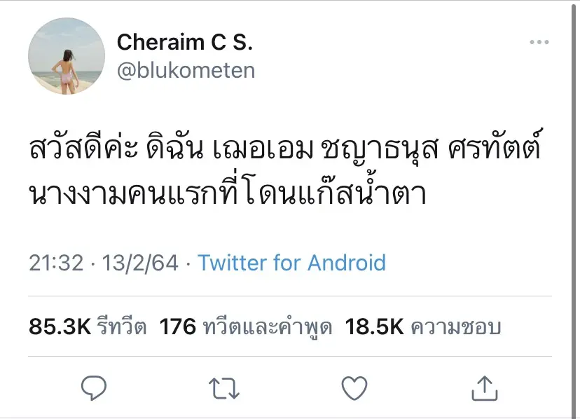 ล่าสุด ได้มี เฌอเอม ชญาธนุส อดีตผู้เข้าประกวด Miss Universe Thailand 2020 ได้ออกมาทวีตข้อความผ่านทวิตเตอร์ว่า “สวัสดีค่ะ ดิฉัน เฌอเอม ชญาธนุส ศรทัตต์ นางงามคนแรกที่โดนแก๊สน้ำตา”