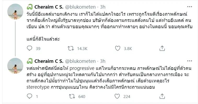 และยังได้บอกอีกว่า “หล่มฟาสซิสต์นี่ต่อให้ progressive แค่ไหนก็ยากจะหลบ ภาพลักษณ์ไม่ได้อยู่ที่ตัวคนสร้าง อยู่ที่อุปทานหมู่จะไหลตามกันไปมากกว่า สำหรับคนเป็นกลางทางการเมือง จะถามลึกลงไปมั้ยว่าทำไมไปชุมนุมแล้วถึงเสียภาพลักษณ์ เสียด้วยเหตุอะไร stereotype การชุมนุมแบบไหน คิดว่าคงไม่มีใครนึกจะถามแน่นอน”