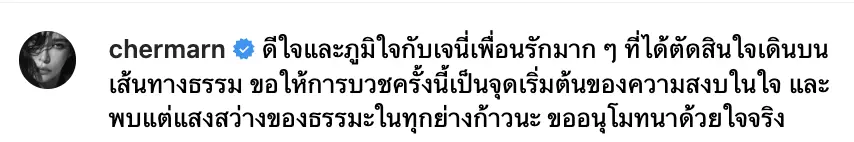 และหนึ่งในคนสำคัญที่ไม่พลาดร่วมอนุโมทนาบุญในครั้งนี้ ก็คือ พลอย เฌอมาลย์ เพื่อนรักคนสนิทของเจนี่ ที่ได้โพสต์ภาพร่วมกับเจนี่ในผ้าไตร พร้อมข้อความสุดซึ้งที่สะท้อนถึงมิตรภาพอันยาวนานและจริงใจ