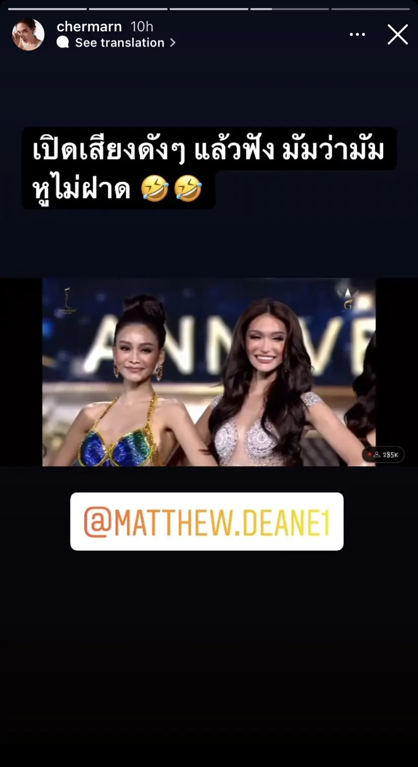 ล่าสุด ด้านรุ่นน้องคนสนิทในวงการ อย่าง พลอย เฌอมาลย์ ก็ได้มีการโพสต์สตอรี่ขณะ แมทธิว กำลังดำเนินหน้าที่พิธีกร พร้อมกับแซวประโยคที่ แมทธิว ได้มีการอ่านรายชื่อผู้สนับสนุนหลักรายหนึ่งของเวทีการประกวดครั้งนี้ ด้วยความที่ แมทธิว เป็นลูกครึ่งอาจทำให้เสียงเกิดเพี้ยนไปบ้าง จึงทำเอา พลอย เฌอมาลย์ ถึงกับสะดุ้ง พร้อมกับโพสต์ภาพแซว แคปชั่นว่า เปิดเสียงดังๆ แล้วฟัง มัมว่ามัม หูไม่ฝาด