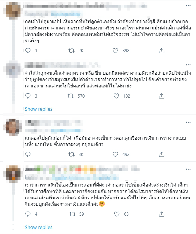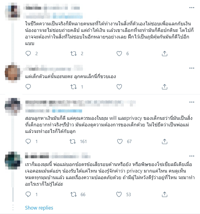 “สอนลูกหาเงินมันก็ดี แต่คุณควรมองในมุม will และprivacy ของเด็กนะว่านี่มันเป็นสิ่งที่เด็กอยากทำจริงๆรึป่าว มันต้องดูความต้องการของเด็กด้วย ไม่ใช่ยึดว่าเป็นพ่อแม่แล้วจะทำอะไรก็ได้กับลูก”