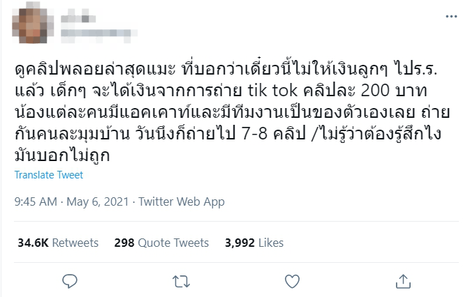 “ดูคลิปพลอยล่าสุดแมะ ที่บอกว่าเดี๋ยวนี้ไม่ให้เงินลูกๆ ไปร.ร. แล้ว เด็กๆ จะได้เงินจากการถ่าย tik tok คลิปละ 200 บาท น้องแต่ละคนมีแอคเคาท์และมีทีมงานเป็นของตัวเองเลย ถ่ายกันคนละมุมบ้าน วันนึงก็ถ่ายไป 7-8 คลิป /ไม่รู้ว่าต้องรู้สึกไง มันบอกไม่ถูก”