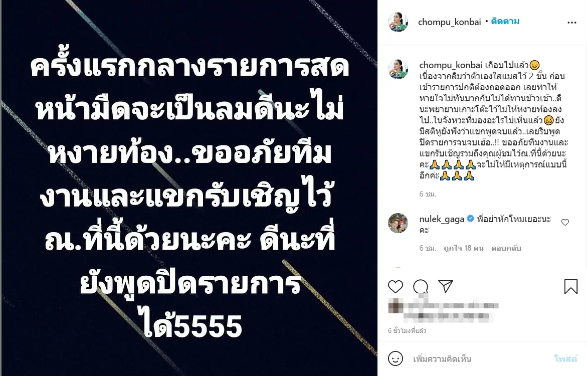 และยังได้บอกเอาไว้ว่า “เกือบไปแล้ว เนื่องจากลืมว่าตัวเองใส่แมสไว้ 2 ชั้น ก่อนเข้ารายการปกติต้องถอดออก เลยทำให้หายใจไม่ทัน บวกกับไม่ได้ทานข้าวเช้า..ดีนะพยายามเกาะโต๊ะไว้ไม่ให้หงายท้องลงไป.. ในจังหวะที่มองอะไรไม่เห็นแล้ว ยังมีสติหูยังฟังว่าแขกพูดจบแล้ว.. เลยรีบพูดปิดรายการจนจบเฮ้อ.. ขออภัยทีมงานและแขกรับเชิญรวมถึงคุณผู้ชมไว้ ณ ที่นี้ด้วยนะคะ จะไม่ให้มีเหตุการณ์แบบนี้อีกค่ะ!!”