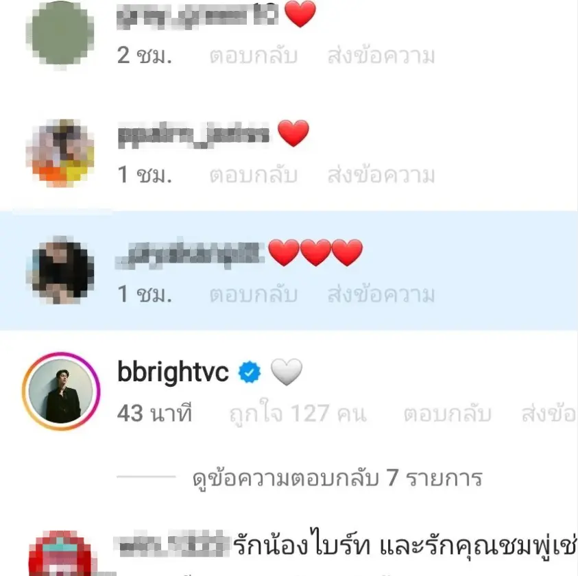 ถึงแม้จะผ่านมาเกือบ 2 วันแล้ว แต่ทางด้านของชมพู่ก็ยังไม่มูฟออนจากโมเมนต์ที่เขินที่สุด ที่เจ้าตัวได้มีการลงรูปภาพคู่กับหนุ่มไบร์ทในไอจีของตัวเอง แล้วก็เกิดสิ่งที่ตัวเองไม่คาดคิด ที่หนุ่มไบร์ทได้เข้ามากดไลก์รูปภาพดังกล่าว พร้อมกับคอมเมนต์สติ๊กเกอร์หัวใจสีขาวให้กับชมพู่ด้วย ทำเอาทั้งเจ้าตัวและแฟนคลับของ แตกตื่นเป็นอย่างมาก เข้ามาถล่มกดไลก์ให้กับคอมเมนต์ของไบร์ทกันเป็นจำนวนมาก