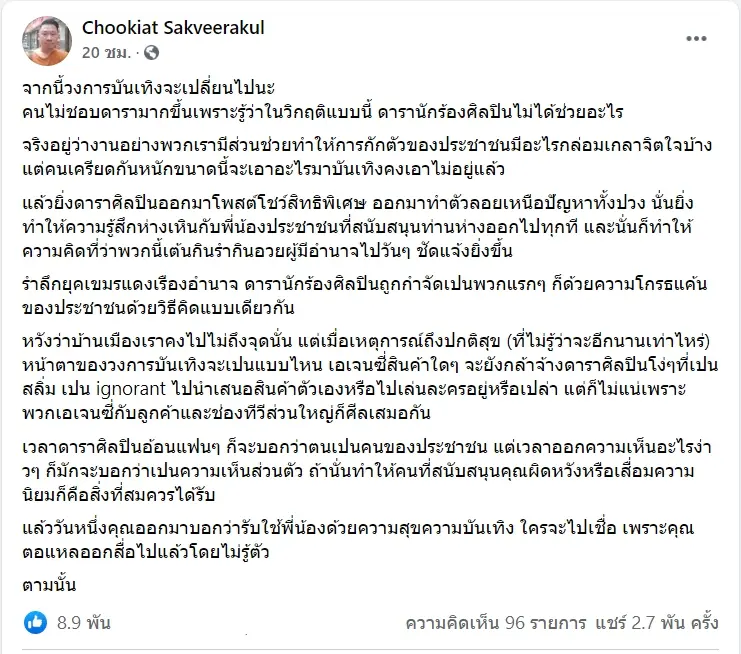 “จากนี้วงการบันเทิงจะเปลี่ยนไปนะ คนไม่ชอบดารามากขึ้นเพราะรู้ว่าในวิกฤติแบบนี้ ดารานักร้องศิลปินไม่ได้ช่วยอะไร จริงอยู่ว่างานอย่างพวกเรามีส่วนช่วยทำให้การกักตัวของประชาชนมีอะไรกล่อมเกลาจิตใจบ้าง แต่คนเครียดกันหนักขนาดนี้จะเอาอะไรมาบันเทิงคงเอาไม่อยู่แล้ว แล้วยิ่งดาราศิลปินออกมาโพสต์โชว์สิทธิพิเศษ ออกมาทำตัวลอยเหนือปัญหาทั้งปวง นั่นยิ่งทำให้ความรู้สึกห่างเหินกับพี่น้องประชาชนที่สนับสนุนท่านห่างออกไปทุกที และนั่นก็ทำให้ความคิดที่ว่าพวกนี้เต้นกินรำกินอวยผู้มีอำนาจไปวันๆ ชัดแจ้งยิ่งขึ้น รำลึกยุคเขมรแดงเรืองอำนาจ ดารานักร้องศิลปินถูกกำจัดเปนพวกแรกๆ ก็ด้วยความโกรธแค้นของประชาชนด้วยวิธีคิดแบบเดียวกัน หวังว่าบ้านเมืองเราคงไปไม่ถึงจุดนั่น