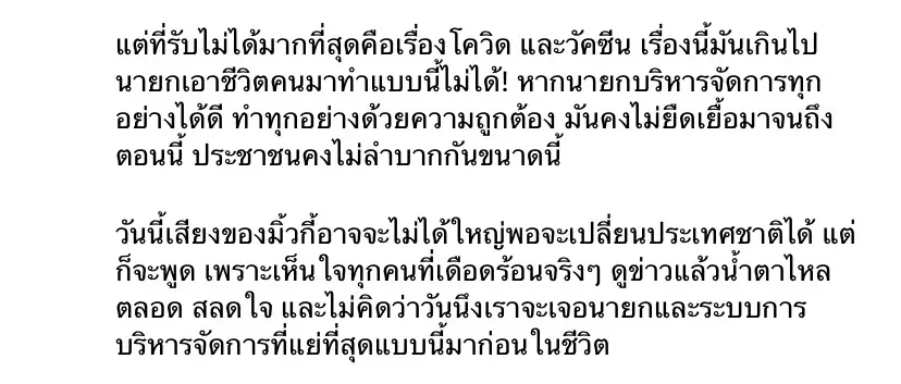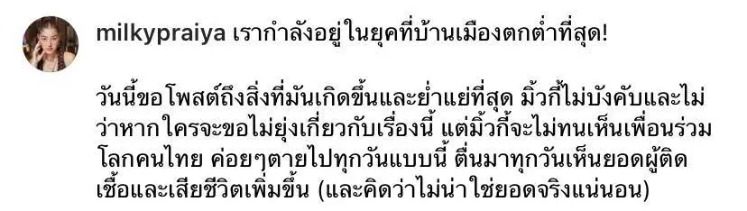 มิ้วกี้ ไปรยา ออกมาโพสต์ระบายความอัดอั้นที่ตัวเองก็ไม่สามารถที่จะเก็บเอาไว้ได้ต่อการบริหารจัดการบ้านเมืองที่ผ่านมา และยิ่งในสถานการณ์ โควิด-19 ที่ร้ายแรงขึ้นทุกวัน แต่ก็ยังไม่สามารถที่จะหาวิธีการที่จะจักการกับปัญหาได้เลย