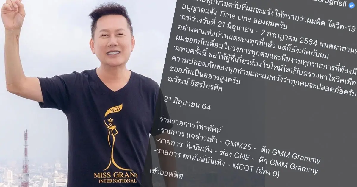 เจ้าของเวทีมิสแกรนด์ “ณวัฒน์” ออกมาประกาศติดเชื้อ COVID-19 พร้อมแจงไทม์ไลน์ ไปหลายที่ คนบันเทิงเตรียมกักตัว