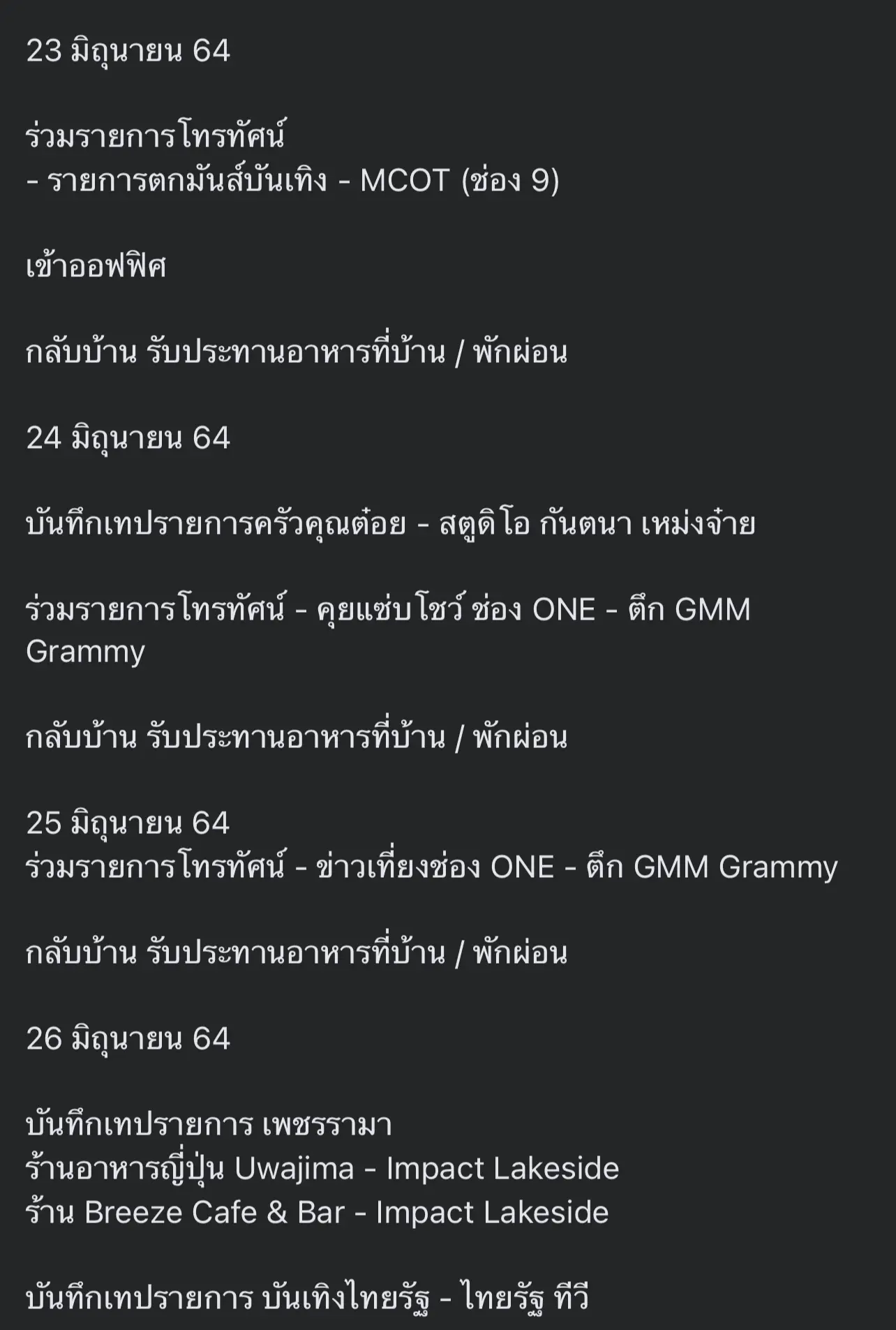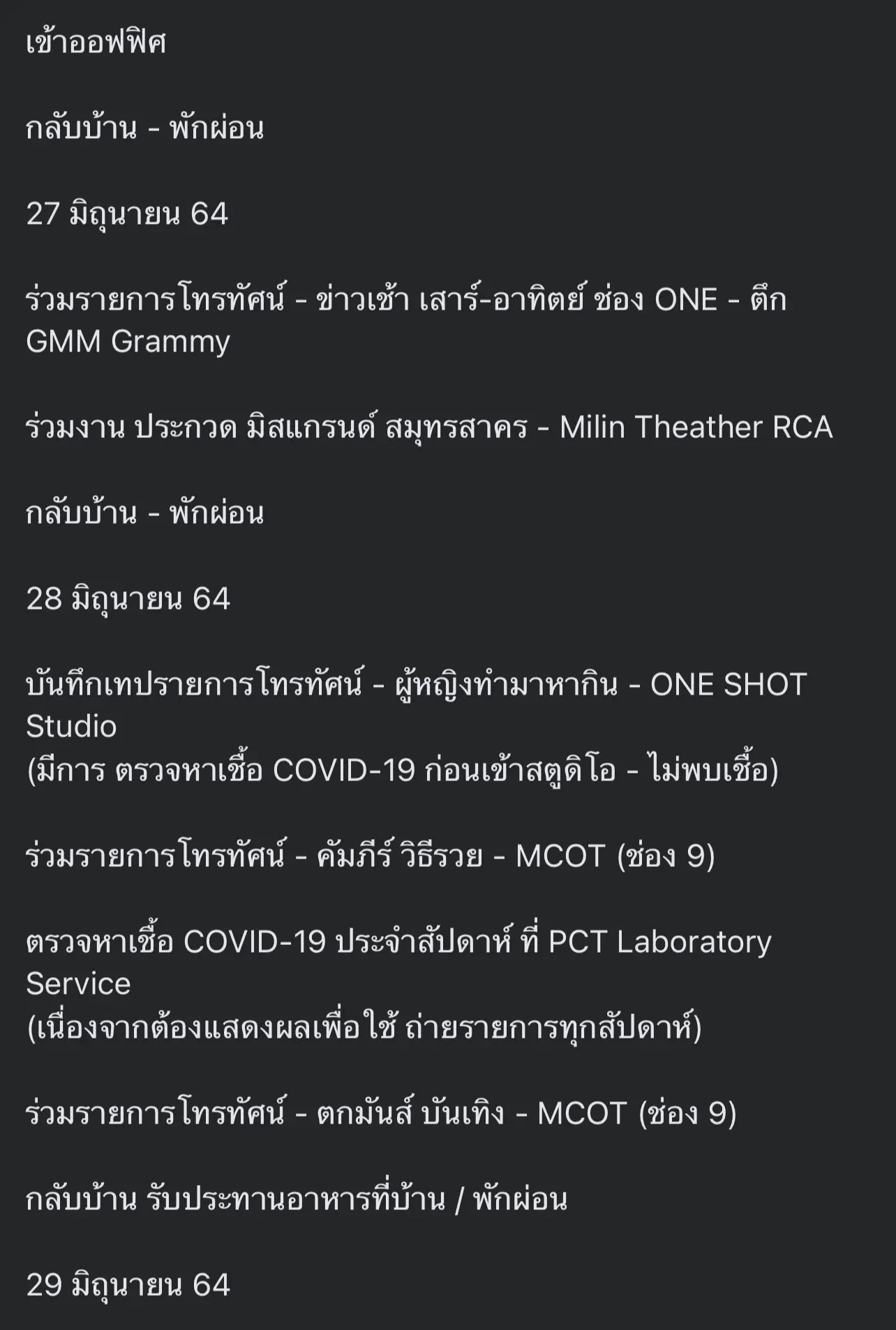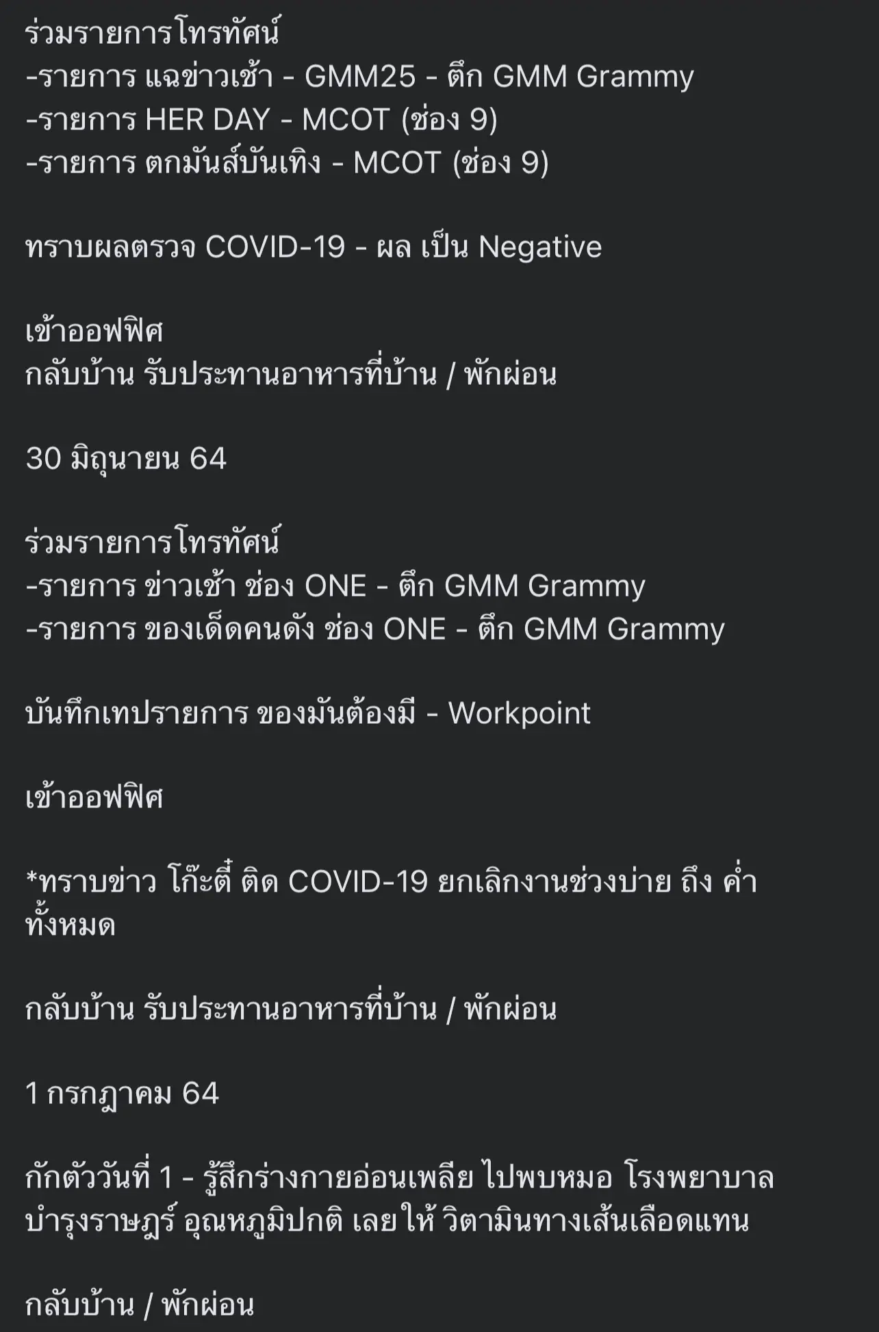 ทั้งนี้จะเห็นได้ว่าจากไทม์ไน์ทั้งหมดได้มีการเดินทางไปทำงานหลายจุดและพบปะกับคนบันเทิงหลาย จากเคสนี้จึงทำให้คนบันเทิงที่รู้ตัวว่าใกล้ชิด หรือสัมผัสกับ “ณวัฒน์” กักตัวโดยด่วน