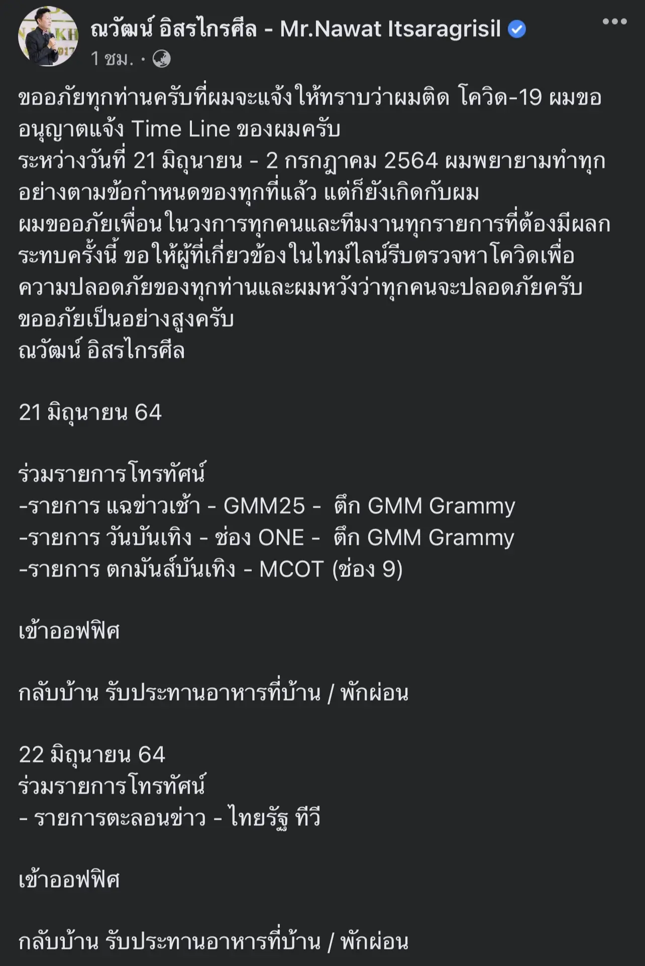 เป็นอีกหนึ่งคนที่ออกมาแจ้งข่าวว่าตนเองติด COVID-19 สำหรับเจ้าของเวทีมิสแกรนด์ “ณวัฒน์ อิสรไกรศีล” พร้อมแจงไทม์ไลน์ละเอียดดังนี้