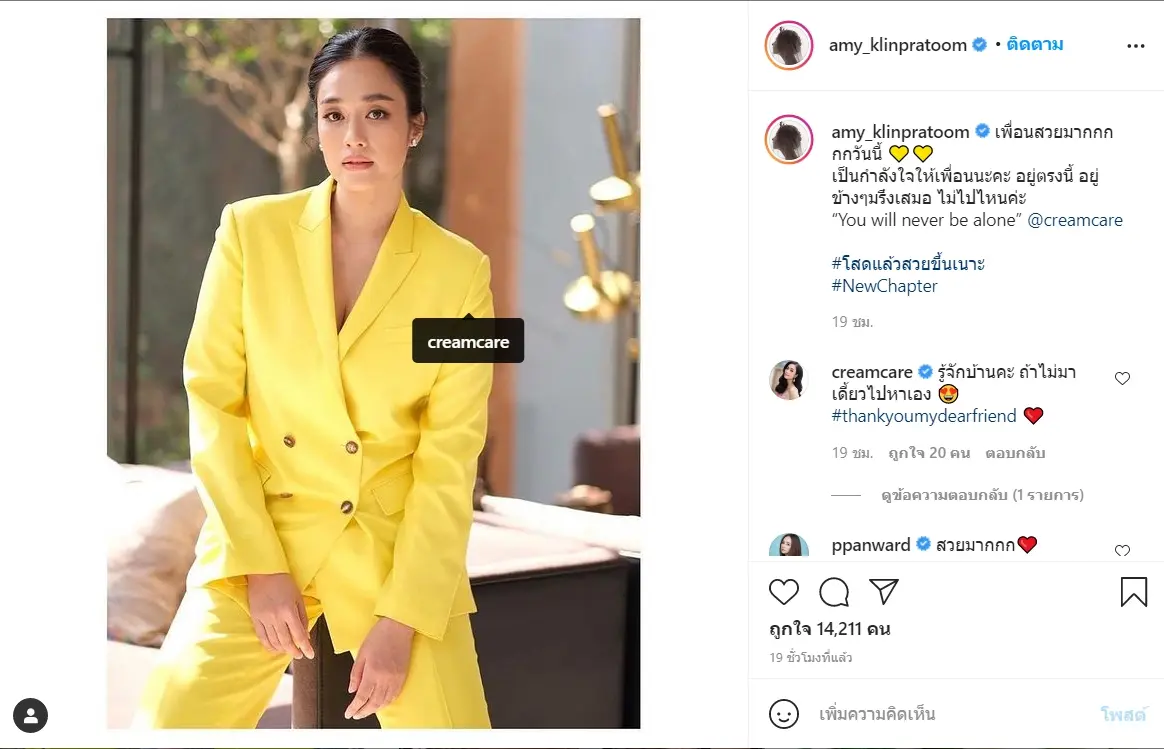 โดยล่าสุดเพื่อนรัก อย่าง เอมี่ กลิ่นประทุม ได้ออกมาโพสต์ภาพพร้อมส่งกำลังใจให้กับเพื่อนรักครีมผ่านอินสตาแกรม ซึ่งระบุว่า “เพื่อนสวยมากกกกกวันนี้ ??