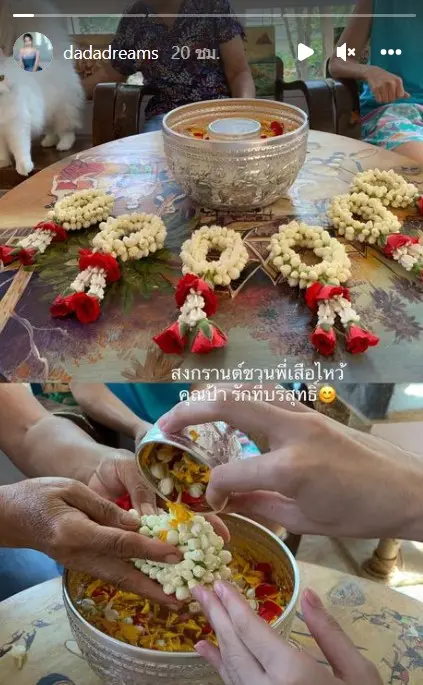 ด้านดรีม แฟนเสือก็ได้โพสต์ภาพที่เจ้าตัวนำพวงมาลัยไปไหว้คุณป้าในวันสงกรานต์ หรือวันครอบครัว พร้อมกับพา เสือ ไปไหว้ด้วย โดยเจ้าตัวได้ถ่ายภาพอัปลงไอจีสตอรี่สุดแฮปปี้ ไม่ได้มีท่าทีกังวล หรือ ทุกข์ใจเหมือนฝั่งของกานต์วิภากรแต่อย่างใด