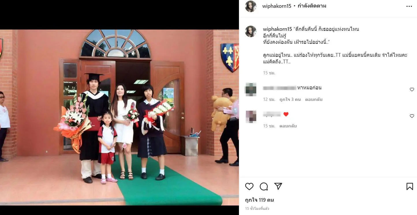 ในขณะเดียวกัน อินสตราแกรมของ กานต์ วิภากร ก็ได้โพสต์ภาพครอบครัวพร้อมแคปชั่นว่า “ดึกดื่นคืนนี้ ก็เธออยู่แห่งหนไหน อีกกี่คืนไม่รู้ ที่ยังคงต้องฝัน เฝ้ารอไปอย่างนี้..” ลูกแม่อยู่ไหน.. แม่ร้องไห้ทุกวันเลย..TT แม่ขี้แยคนนี้คนเดิม จำได้ไหมคะ แม่คิดถึง..TT..