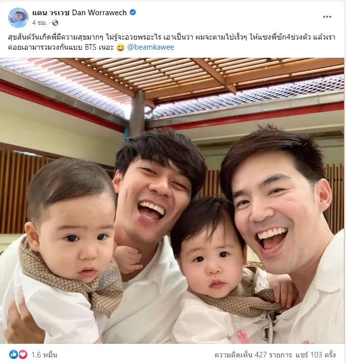 ทางฝั่งของแดนเลยมีการเข้าไปอวยพรพี่ชายด้วยรูปเดียวกันที่บีมเข้ามาอวยพร พร้อมกับตอบคำถามเรื่องของลูก โดยบอกว่า ไม่รู้ว่าจะอวยพรว่าอะไร เอาเป็นว่า ผมจะตามไปเร็วๆ ให้แซงพี่ซัก4ช่วงตัว แล้วเราค่อยเอามารวมวงกันแบบ BTS เนอะ