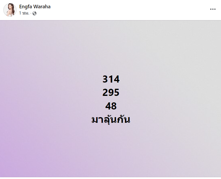 - อิงฟ้า วราหะ Miss Grand Thailand 2565 ปล่อยเลขเด็ด 2 ตัว 3 ตัวตรง ๆ งวดนี้เจ้าตัวเผยว่า 314 ,295 ,48 มาลุ้นกัน