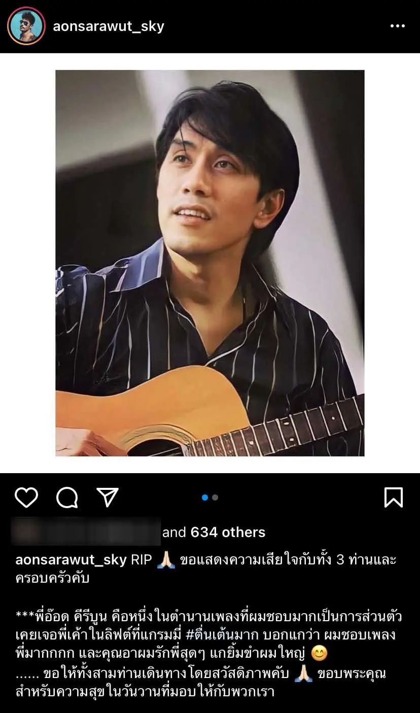 - อ้น สราวุธ โพสต์ข้อความว่า RIP 🙏🏻 ขอแสดงความเสียใจกับทั้ง 3 ท่านและครอบครัวครับ ***พี่อ๊อด คีรีบูน คือหนึ่งในตำนานเพลงที่ผมชอบมากเป็นการส่วนตัว เคยเจอพี่เค้าในลิฟต์ที่แกรมมี่ #ตื่นเต้นมาก บอกแกว่า ผมชอบเพลงพี่มากกกก และคุณอาผมรักพี่สุดๆ แกยิ้มขำผมใหญ่ 😊…… ขอให้ทั้งสามท่านเดินทางโดยสวัสดิภาพคับ 🙏🏻 ขอบพระคุณสำหรับความสุขในวันวานที่มอบให้กับพวกเรา