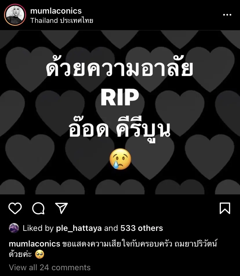 - มัม ลาโคนิคส์ โพสต์ข้อความว่า ด้วยความอาลัย RIP อ๊อด คีรีบูน ขอแสดงความเสียใจกับครอบครัว ถมยาปริวัตน์ ด้วยค่ะ 🥺