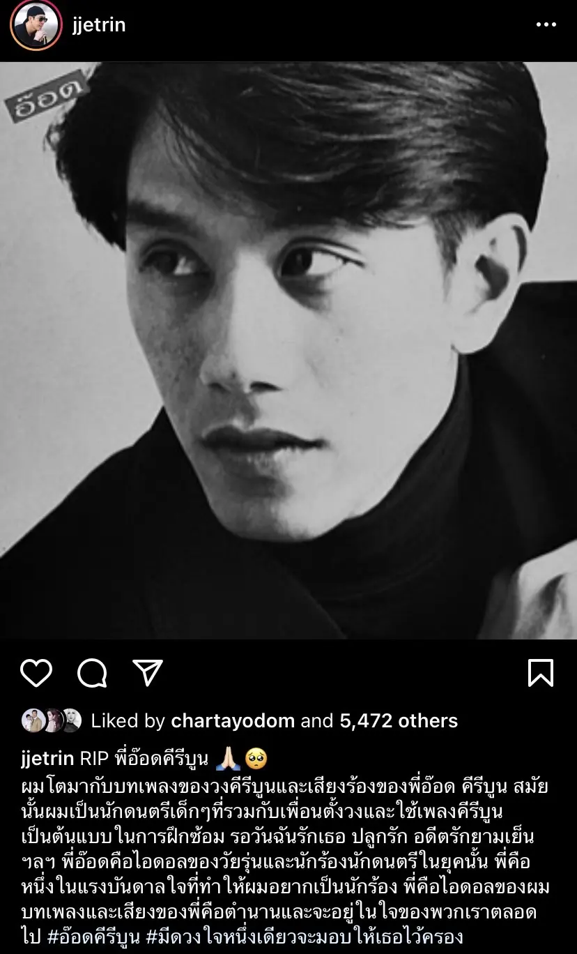 - เจ เจตริน โพสต์ข้อความว่า RIP พี่อ๊อดคีรีบูน 🙏🏻🥺 ผมโตมากับบทเพลงของวงคีรีบูนและเสียงร้องของพี่อ๊อด คีรีบูน สมัยนั้นผมเป็นนักดนตรีเด็กๆที่รวมกับเพื่อนตั้งวงและใช้เพลงคีรีบูนเป็นต้นแบบในการฝึกซ้อม รอวันฉันรักเธอ ปลูกรัก อดีตรักยามเย็น ฯลฯ พี่อ๊อดคือไอดอลของวัยรุ่นและนักร้องนักดนตรีในยุคนั้น พี่คือหนึ่งในแรงบันดาลใจที่ทำให้ผมอยากเป็นนักร้อง พี่คือไอดอลของผม บทเพลงและเสียงของพี่คือตำนานและจะอยู่ในใจของพวกเราตลอดไป #อ๊อดคีรีบูน#มีดวงใจหนึ่งเดียวจะมอบให้เธอไว้ครอง