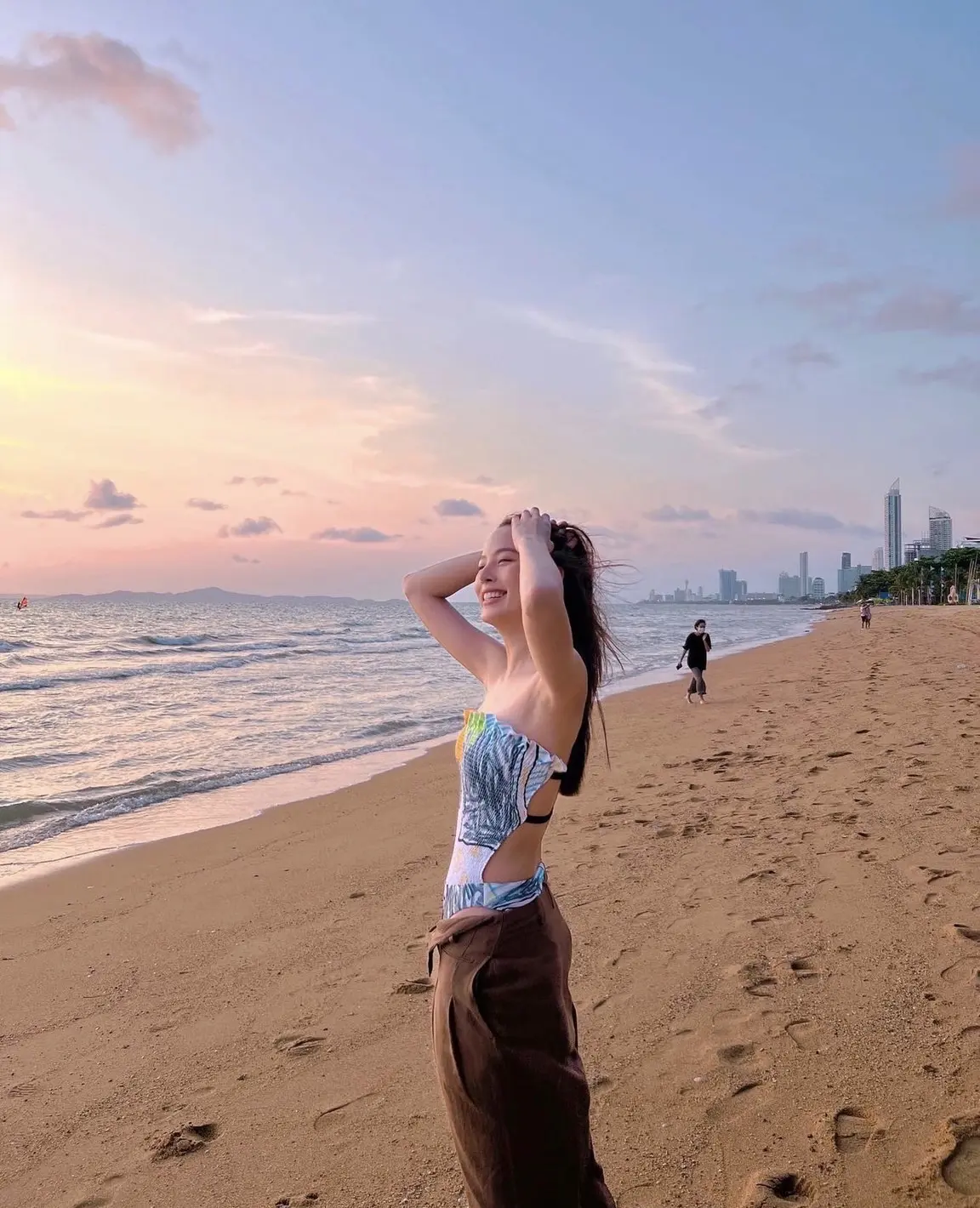 เริ่มต้นกันที่นางเอกสาว ณิชา ณัฏฐณิชา ดังวัธนาวณิชย์ มาในชุดว่ายน้ำวันพีซเกาะอกแบบ High-class sexy ตัดเย็บด้วยเทคนิกสม็อคแต่งระบาย พิมพ์ลายแมวคอลเลกชั่น Spring/Summer 2022: FROM DIARY TO CANVAS แมตช์กับกางเกงขายาวสีน้ำตาล เดินเล่นชิลล์ๆริมทะเลชมวิวพระอาทิตย์ตกดิน