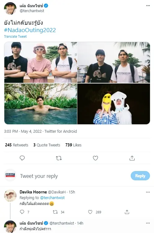 ซึ่งโพสต์ดังกล่าวนั้น เต๋อ ได้ออกมาโพสต์ภาพบรรยากาศพร้อมแคปชัน ยังไม่กลับนะรู้ยัง ทันใดนั้นเอง ใหม่ ดาวิกา ก็ได้เมนต์อย่างทันทีว่า กลับได้แล้วคิดถึงงงง