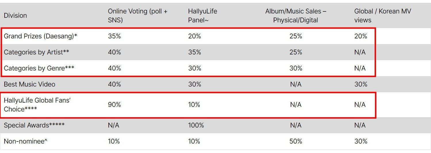 1. Grand Prizes (Daesang) ใช้ตัดสินสาขา Artist of the Year, Song of the Year และ Album of the Year โดยคะแนนจะมาจากการโหวต 35% กรรมการ 20% ยอดขายอัลบัม/เพลง 25% ยอดวิว MV 20%