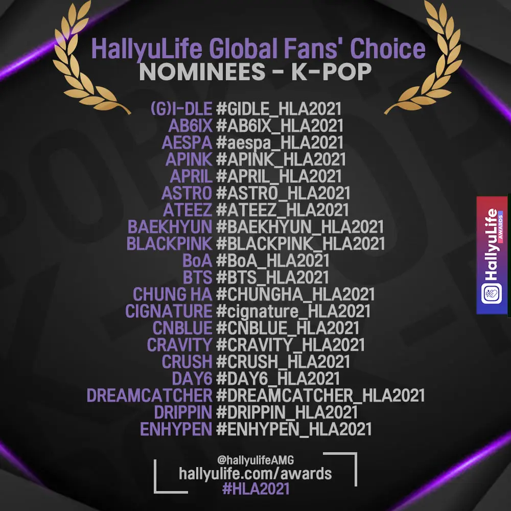 HallyuLife Awards 2021 เป็นรางวัลที่มอบให้กับเหล่าศิลปิน K-POP ซึ่งจัดขึ้นเป็นปีแรก โดยได้แบ่งรางวัลทั้งหมดออกเป็น 11 สาขา ได้แก่ Best Group, Best Solo Artist, Best Band, Best Dance Performance, Best Vocal Performance, Rookie of the Year, Music Video of the Year, Album of the Year, Song of the Year, Artist of the Year และ HallyuLife Global Fans’ Choice และแต่ละสาขาจะมีเกณฑ์การตัดสินที่ต่างกันออกไป