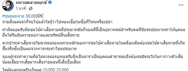 ซึ่งเป็นผลจากการกระทำโดยประมาท ของผู้กระทำความผิดไม่ควรต่อรอง ยิ่งเป็นดาราเป็นบุคคลสาธารณะยิ่งต้องระมัดระวังในการวางตัวเสียน้อยเสียยากเสียมากเสียง่าย ตอนนี้เสียชื่อเสียง ซึ่งไม่คุ้มเลย กับเงินแค่ 10,000 – 20,000 บาท