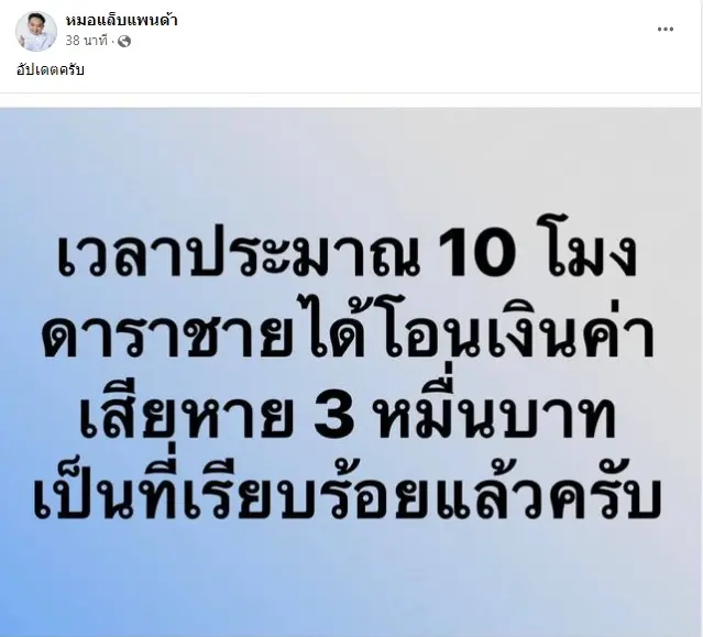 อย่างไรก็ตาม ล่าสุดในวันนี้ 30 เม.ย.65 เฟซบุ๊กเพจหมอแล็บแพนด้า ได้มีการโพสต์ข้อความผ่านเฟซบุ๊ก ระบุข้อความว่า เวลาประมาณ 10 โมง ดาราชายได้โอนเงินค่าเสียหาย 3 หมื่นบาท เป็นที่เรียบร้อยแล้ว