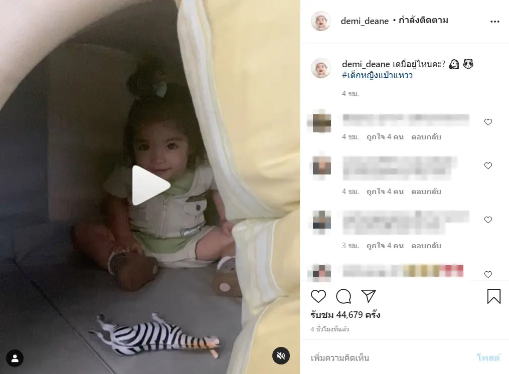 โดยกิจกรรมอวดความน่ารักล่าสุด คือเด็กหญิงแป๋วแหวว ของครอบครัวดีน เล่นซ่อนแอบสุดกุ๊งกิ๊งในบ้านโดมหลังเล็ก ซึ่งสาวลิเดียก็เอาหมอนบังเรียกรอยยิ้มละลายใจเพราะความสนุกสนานของน้องเดมี่ได้เป็นอย่างดี