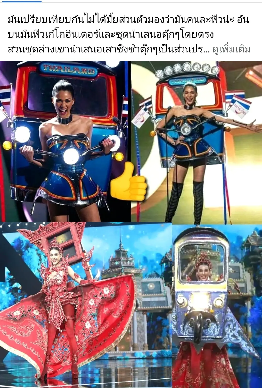 ที่มีคนเอามาเปรียบเทียบกับชุดตุ๊ก ๆไทยแลนด์ ของแนท ปี 2015 ว่าทำไม่สวย และเปรียบเทียบถึงวัสดุในการทำ เป็นต้น เหตุผลอันดับแรกต้องขอกล่าวก่อนว่า รอบนี้คือรอบชุดประจำจังหวัด และจังหวัดนี้คือกรุงเทพมหานคร ซึ่งเอกลักษณ์ที่โดดเด่น มันค่อนข้างชัดมาก และสิ่งที่ผมต้องการสื่อสารให้คนดูเข้าใจก็คือ การนั่งรถตุ๊ก ๆ ไปเช็กอินที่เสาชิงช้า สถาปัตยกรรมที่โดดเด่นและเป็นเอกลักษณ์มาก ๆ เราไม่ได้นำเสนอเรื่องราวเกี่ยวกับรถตุ๊ก ๆ และเป็นเพียงหลักการเชื่อมโยงเรื่องราวเพียงเท่านั้น และมิได้มีเจตนา copy ชุดอันเป็นผลงานที่ประจักษ์ของคนทั่วโลก ส่วนวัสดุที่เราใช้ทำชุด มันคือ แผ่นยางกับโฟมอัดพิเศษครับ เราทำเองด้วยมือ เพราะผมเป็นครูศิลปะ สรุปคือ ชุดนี้พาทุกคนมาเที่ยวที่เสาชิงช้าครับ