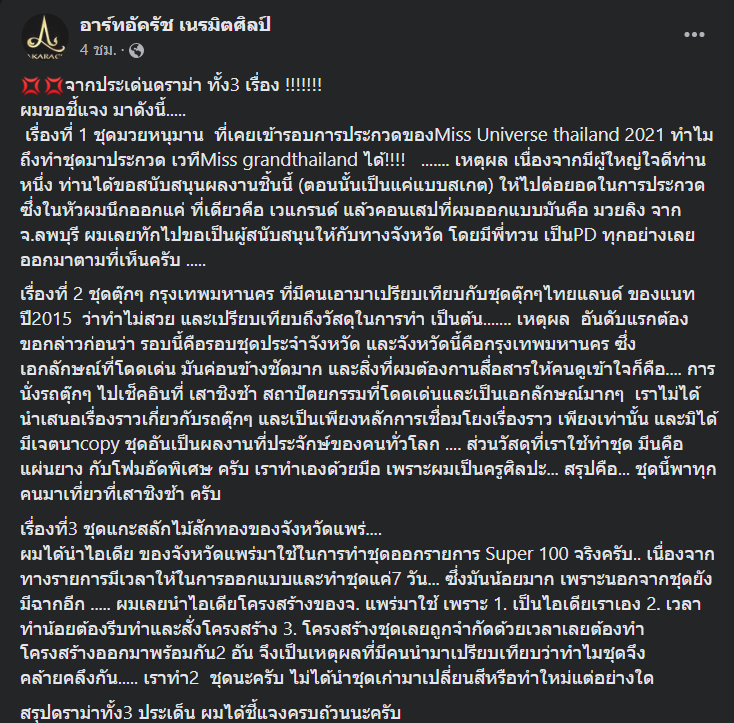 อาร์ทอัครัช เนรมิตศิลป์ ชี้แจงผ่านทางเฟซบุ๊กส่วนตัว ปมดราม่า ชุดประจำชาติ ภายหลังการประกวดในรอบพิเศษ เมื่อค่ำคืนที่ผ่านมา (24 เม.ย. 65)