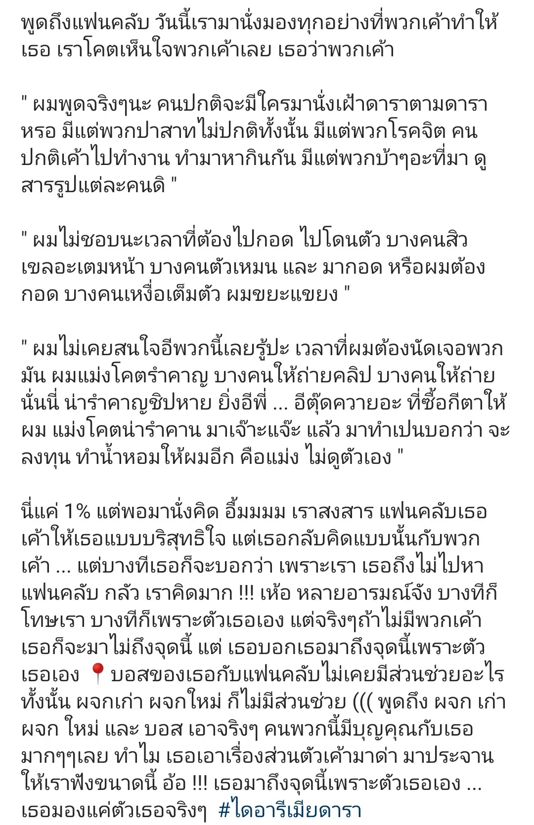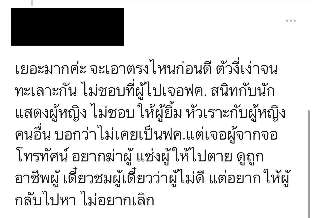 ส่วนเรื่องที่แอคเคาท์รายนี้ชาวเน็ตบอกว่ามีการคุยกันในคลับเฮาส์เมื่อคืนที่ผ่านมา มีหลายเรื่องมาที่โป๊ะแตก จะเอาตรงไหนก่อนดี มีทั้งงี่เง่าจนทะเลาะกัน ไม่ชอบที่ผู้ชายไปเจอแฟนคลับ สนิทกับนักแสดงผู้หญิงคนอื่น ไม่ชอบให้ผู้ชายยิ้ม หรือ หัวเราะกับผู้หญิงคนอื่น บอกว่าไม่เคยเป็นแฟนคลับ แต่เจอผู้ชายจากจอโทรทัศน์ อยากฆ่าผู้ชาย แช่งผู้ชายให้ไปตาย ดูถูกอาชีพผู้ชาย เดี๋ยวชมผู้ชาย เดี๋ยวว่าผู้ชายไม่ดี แต่อยากให้ผู้ชายกลับไปหา ไม่อยากเลิก