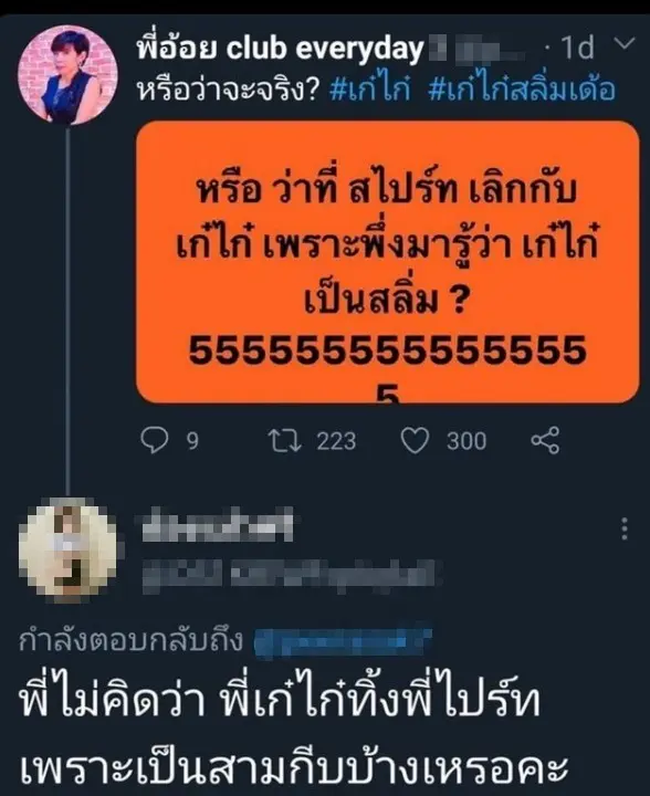 ก่อนหน้านี้ ดีเจพี่อ้อย หรือ นภาพร ไตรวิทย์วารีกุล ได้มีการแคปข้อความทวิตเตอร์ปลอมของตัวเอง ที่โพสต์ถึง เก๋ไก๋ – สไปร์ท กรณีเลิกรากัน มาโพสต์ผ่านอินสตาแกรม พร้อมกับเคลียร์ข้อเท็จจริงว่า อันนี้ไม่ใช่พี่อ้อยนะคะ ขออนุญาติดำเนินการตามกฎหมาย ในทวิตเตอร์ มี account เดียวคือ @djpeeaoy ค่ะ ขอบคุณน้องๆที่ส่งมาให้ดูด้วยนะ