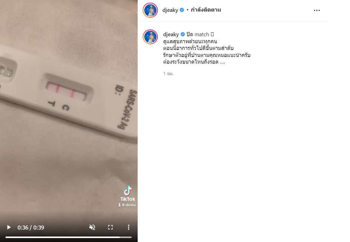 ดีเจเอกกี้ แจ้งผ่านอินสตาแกรมส่วนตัว ผลตรวจ ‘พบเชื้อ’ Covid-19 ตอนนี้อาการทั่วไปดีขึ้นตามลำดับ และรักษาอยู่บ้านตามคุณหมอแนะนำ